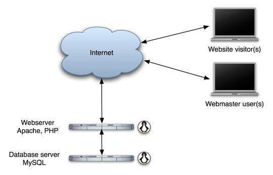 This section describes the architecture for Exponential running on one webserver and one database server. This is a similar configuration as that used for clustering, except a clustered environment has more webservers.