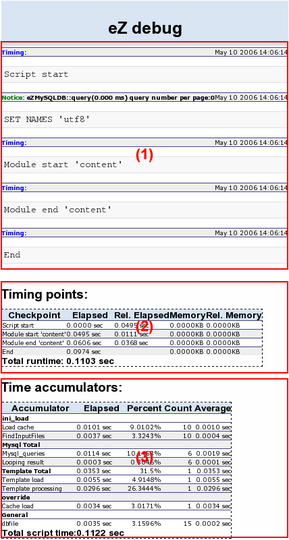 This section of the debug output displays timing information about various parts of the system, such as template processing, character set conversions, XML processing and information about SQL queries. This section also displays the results from the debug-accumulator template function.